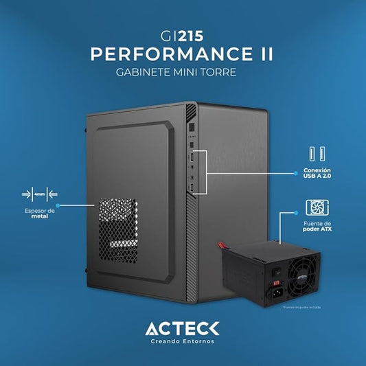 Gabinete Acteck Mini Torre Performance II GI215 / Max MB M-ATX Fuente ATX 500 W / 2x USB 2.0 / Full Metálico + Frente Solido / Essential Negro